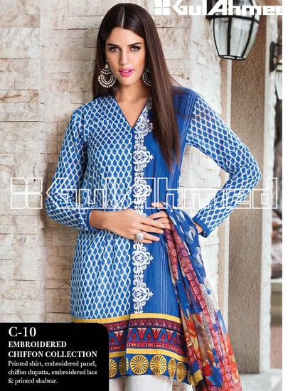 Today we brought Gul ahmed La Chiffon Collection 2013 collected from 2013 spring magazine by Gulahmed Textile Mills has been launched officially few days ago.La Chiffon Collection Designed on chiffon fabric and has various type of nourishment, This Beautiful Collection price is reasonable and start from 3,750 and go till 6,500.Gul Ahmed added 15 Prints in La chiffon catalog from wild to Zigzag, Geometric to Thrilling, and Floral to embossy that look very elegant.Most of the Outfits are embroidered with Bail Embroidery Pattern, Bunches, and Motifs with stunning woven Thread on neckline, borders and waist parts of shirts.Some of the Lawn attires has strip work also lets choose a one lovely Chiffon Dress according to your taste.if you want to check other Gul Ahmed summer lawn then please visit below given Links.Gul Ahmed Magazine 2013 here.
